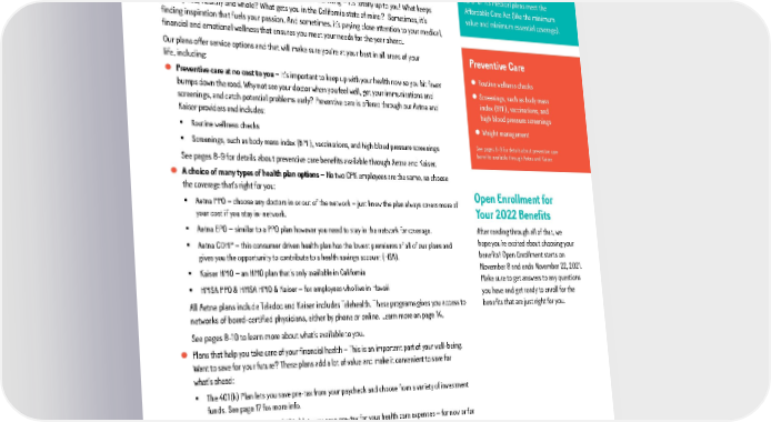 OVERVIEW Affordable Care Act aka Healthcare Reform We create phenomenal experiences for our guests by bringing the biggest and best parts of ourselves to work. We are committed to help you in your journey to stay strong and inspired and to live well All of CPK’s medical plans meet the being you. So what does living well mean? Well, that’s the thing – it’s totally up to you! What keeps Affordable Care Act (like the minimum you inspired, healthy and whole? What gets you in the California state of mind? Sometimes, it’s value and minimum essential coverage). finding inspiration that fuels your passion. And sometimes, it’s paying close attention to your medical, financial and emotional wellness that ensures you meet your needs for the year ahead. Our plans offer service options and that will make sure you’re at your best in all areas of your Preventive Care life, including: l Preventive care at no cost to you – It’s important to keep up with your health now so you hit fewer l Routine wellness checks bumps down the road. Why not see your doctor when you feel well, get your immunizations and l Screenings, such as body mass screenings, and catch potential problems early? Preventive care is offered through our Aetna and index (BMI), vaccinations, and Kaiser providers and includes: high blood pressure screenings Ÿ Routine wellness checks l Weight management Ÿ Screenings, such as body mass index (BMI), vaccinations, and high blood pressure screenings See pages 8-9 for details about preventive care benefits available through Aetna and Kaiser. See pages 8-9 for details about preventive care benefits available through Aetna and Kaiser. l A choice of many types of health plan options – No two CPK employees are the same, so choose the coverage that’s right for you: Open Enrollment for Ÿ Aetna PPO – choose any doctors in or out of the network – just know the plan always covers more of Your 2022 Benefits your cost if you stay in-network. Ÿ Aetna EPO – similar to a PPO plan however you need to stay in the network for coverage. After reading through all of that, we Ÿ Aetna CDHP – this consumer driven health plan has the lowest premiums of all of our plans and hope you’re excited about choosing your gives you the opportunity to contribute to a health savings account (HSA). benefits! Open Enrollment starts on Ÿ Kaiser HMO – an HMO plan that’s only available in California November 8 and ends November 22, 2021. Ÿ HMSA PPO & HMSA HMO & Kaiser – for employees who live in Hawaii Make sure to get answers to any questions you have and get ready to enroll for the All Aetna plans include Teladoc and Kaiser includes Telehealth. These programs gives you access to benefits that are just right for you. networks of board-certified physicians, either by phone or online. Learn more on page 14. See pages 8-10 to learn more about what’s available to you. l Plans that help you take care of your financial health – This is an important part of your well-being. Want to save for your future? These plans add a lot of value and make it convenient to save for what’s ahead: Ÿ The 401(k) Plan lets you save pre-tax from your paycheck and choose from a variety of investment funds. See page 17 for more info. Ÿ Health Savings Accounts (HSAs) lets you save pre-tax for your health care expenses – for now or for later. You can only use this account with a with a High Deductible Plan (CDHP). See page 8 for details. l A Program that helps you through any life challenge including: mental and emotional health, financial issues, relationships, legal matters and more – Don’t overlook this important component of your total well-being. Ÿ Employee Assistance Program (EAP) helps you deal with all kinds of life issues. Because sometimes life gets bumpy. There are lots of tools and resources to use – even a phone line that’s available 24/7. See page 6. 3