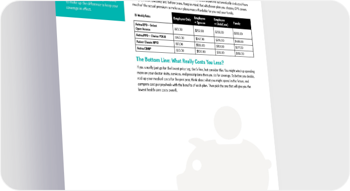 CHECK, PLEASE — Keeping Up Payments Payroll deductions are automatic — but What the Plans Cost coverage isn’t. If for any reason it isn’t Below are all your options for plans and coverage levels. Costs shown are automatically deducted from possible to deduct the full amount from your paycheck, biweekly and before taxes. Keep in mind that whichever plan you choose, CPK covers your paycheck, it’s your responsibility much of the actual premium to make our plans more affordable for you and your family. to make up the difference to keep your coverage in effect. Bi-Weekly Rates Employee Only Employee Employee Family + Spouse + Child(ren) Aetna EPO – Select $80.00 $252.00 $206.00 $355.00 Open Access Aetna PPO – Choice POS II $140.00 $347.00 $276.00 $488.00 Kaiser Classic HMO $51.00 $196.00 $161.00 $277.00 Aetna CDHP $30.00 $109.00 $90.00 $155.00 The Bottom Line: What Really Costs You Less? If you usually just go for the lowest price tag, that’s fine, but consider this: You might wind up spending more on your doctor visits, services, and prescriptions than you do for coverage. So before you decide, add up your medical costs for the past year, think about what you might spend in the future, and compare cost per paycheck with the benefits of each plan. Then pick the one that will give you the lowest health care costs overall. 10