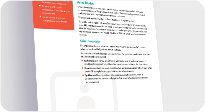 WHEN TO CALL? Call Teladoc When: Picture this: it’s midnight. On Saturday. You’re pretty sure your kid has an ear infection. Wouldn’t it be l You can’t see your regular primary great just to call a doctor and get the prescription emailed to your pharmacy instead of spending half care physician due to timing or travel the night sitting in urgent care? l You need medical attention that you Aetna Teladoc think won’t require a doctor visit CPK employees and dependents who are enrolled in one of our Aetna plans now have 24/7 access l You need to refill a regular to a network of board-certified physicians through Teladoc. The doctors can diagnose many medical prescription and don’t have time for conditions, recommend treatment, and even prescribe medications. an appointment They’re available anytime, any where — all over the phone or through online video. l You want advice or a second opinion about a medical matter The cost for services is just a $10 copay ($40 copay if you’re enrolled in the CDHP until you meet the deductible), and you can pay with a credit card. To set up your account, visit Teladoc.com/Aetna and follow the instructions. To ensure that Teladoc knows you and is ready to help when you need it, don’t skip the medical history section! Then call 855-Teladoc (855-835-2362), or visit member.teladoc. com/cpk. Kaiser Telehealth CPK employees and dependents who are enrolled in our Kaiser CA plan also have 24/7 access to a network of board-certified physicians through Telehealth. You don’t have to visit a facility to get care from the Kaiser Permanente team you know and trust. Here’s how you can get the care you need: l By phone: schedule a phone appointment or call an advice nurse for on-demand guidance. To schedule a phone appointment, call your local appointments and advice number found at kp.org l By email: connect with your care team anytime. Most members receive a reply within 48 hours - often sooner. Visit kp.org for location-specific information and appointments. l By video: schedule an appointment with your doctor, meet with a specialist, or have an on-demand video visit with an on-call physician. Visit kp.org for location-specific information and appointments. 14