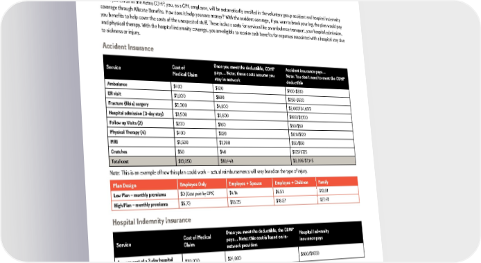 Accident & Hospital Indemnity Insurance When you enroll in the Aetna CDHP, you, as a CPK employee, will be automatically enrolled in the voluntary group accident and hospital indemnity coverage through Allstate Benefits. How does it help you save money? With the accident coverage, if you were to break your leg, the plan would pay you benefits to help cover the costs of the unexpected stuff. These include costs for services like an ambulance transport, your hospital admission, and physical therapy. With the hospital indemnity coverage, you are eligible to receive cash benefits for expenses associated with a hospital stay due to sickness or injury. Accident Insurance Cost of Once you meet the deductible, CDHP Accident insurance pays… Service Medical Claim pays… Note: these costs assume you Note: You don’t need to meet the CDHP stay in network deductible Ambulance $400 $320 $100-$200 ER visit $1,000 $800 $250-$500 Fracture (fibia) surgery $6,000 $4,800 $2,000/$4,000 Hospital admission (3-day stay) $3,500 $2,800 $800/$1,100 Follow up Visits (2) $200 $160 $50/$50 Physical Therapy (4) $400 $320 $120/$120 MRI $1,500 $1,200 $50/$50 Crutches $50 $40 $125/$125 Total cost $13,050 $10,440 $3,995/$7,145 Note: This is an example of how this plan could work – actual reimbursements will vary based on the type of injury. Plan Design Employee Only Employee + Spouse Employee + Children Family Low Plan – monthly premiums $0 (Cost paid by CPK) $4.14 $6.51 $10.91 High Plan – monthly premiums $5.70 $13.95 $18.67 $27.48 Hospital Indemnity Insurance Cost of Medical Once you meet the deductible, the CDHP Hospital Indemnity Service Claim pays… Note: this cost is based on in- insurance pays network providers Average cost of a 3-day hospital $30,000 $24,000 $800/$1600 stay Note: This is an example of how this plan could work – actual reimbursements will vary based on the type of injury. Plan Design Employee Only Employee + Spouse Employee + Children Family Low Plan – monthly premiums $0 (Cost paid by CPK) $18.09 $7.80 $20.48 High Plan – monthly premiums $10.71 $47.11 $26.41 $51.79 9